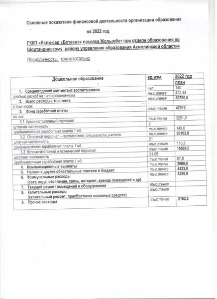 Мектепке дейінгі ұйымның қаржылық қызметінің негізгі көрсеткіштері